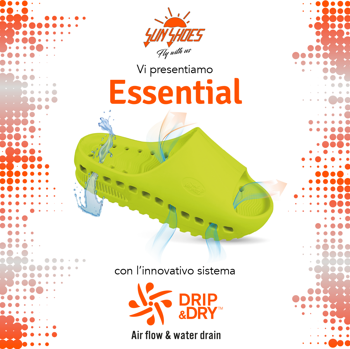 Abbiamo combinato uno stile irresistibile ad una tecnologia che abbina l’innovativo sistema brevettato Drip&Dry™ al nostro materiale EVA di ultima generazione Foamsand: tutto ciò per garantire al tuo piede di rimanere asciutto e ventilato in ogni condizione.